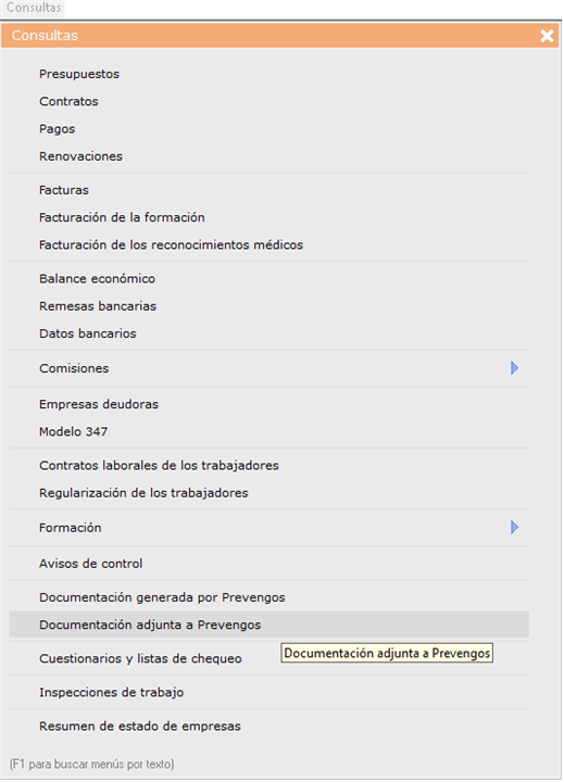 Para acceder a la búsqueda de documentación adjunta desde la pantalla principal de cualquiera de los módulos de Prevengos, accederemos al menú desplegable de "Consultas -> Consulta de documentos adjuntos en empresas, centros y trabajadores".