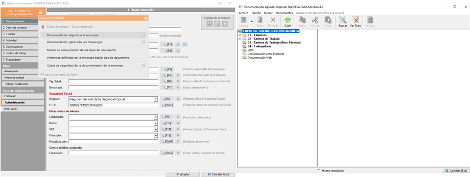 Además de generar su propia documentación, Prevengos permite adjuntar documentos a empresas, centros, trabajadores y contratas en su ficha de datos.