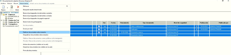 Podremos publicar la documentación de forma masiva, seleccionando la documentación que queramos publicar y accediendo al menú desplegable de "Herramientas" donde aparecerá la opción de "Publicar documentos seleccionados".