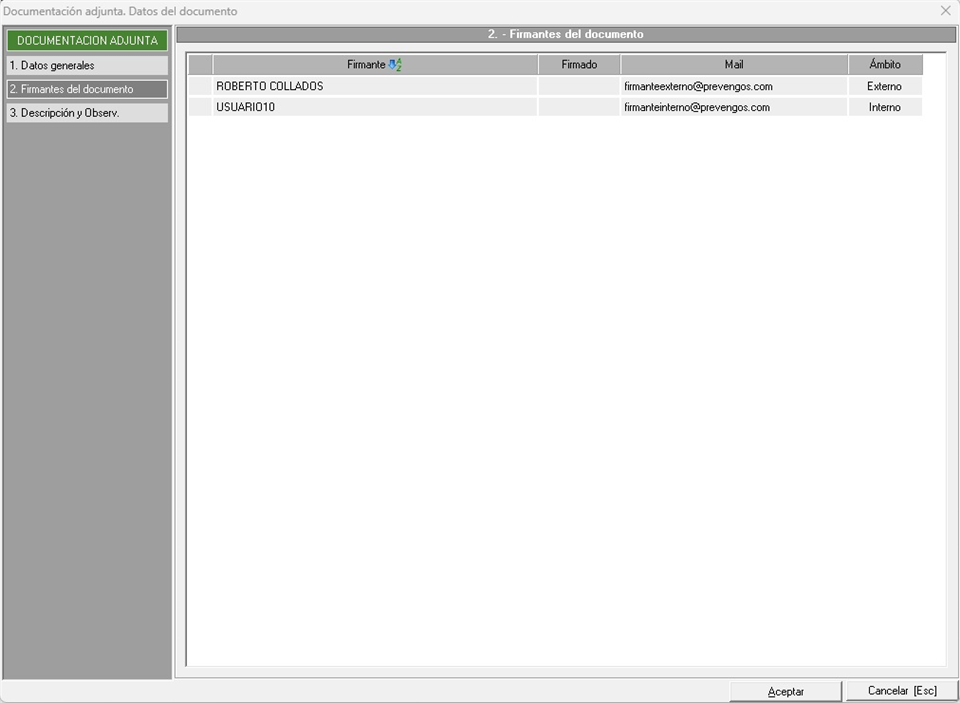 Si el documento ha sido enviado a firma o ha sido firmado con certificado digital por un usuario de Prevengos, en este apartado podremos visualizar quién debe firmar el documento o por quién ha sido firmado. En la columna 'Ámbito' mostrará si el firmante es interno (usuario de Prevengos) o externo (firma con plataforma de firma externa).
