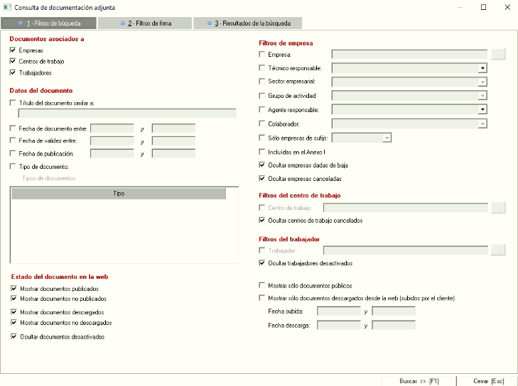 Para consultar la documentación adjunta se diponen de dos pestañas de filtrado, en la que la primera de ellas contiene filtros generales ("Filtros de búsqueda") y la segunda filtros sobre firma ("Filtros de firma") . Se van a explicar a continuación para terminar con las Herramientas disponibles en el resultado de la consulta.