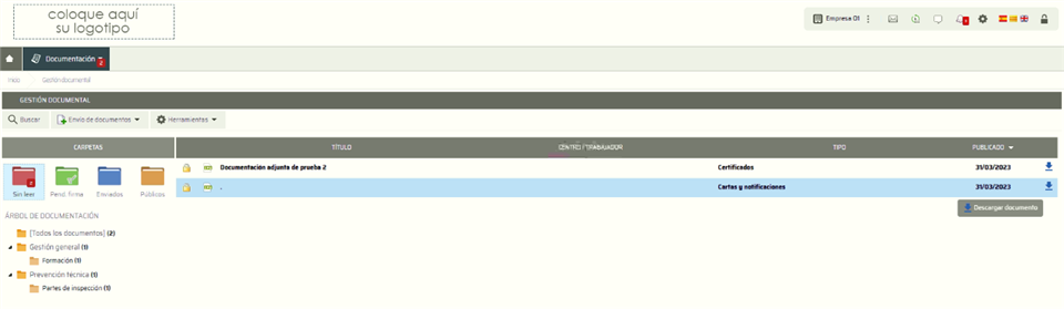 . De lo contrario, estarán en verde. En el ejemplo de la siguiente imagen, el trabajador del documento adjunto "Títulos" está desactivado, mientras que el "Documento general" de la empresa está desactivado.
