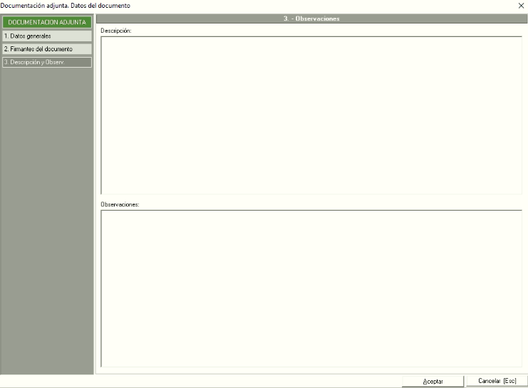 En el punto 3 de los datos del documento adjunto encontraremos dos campos de texto para incluir una descripción de dicho documento y un apartado para las observaciones pertinentes.