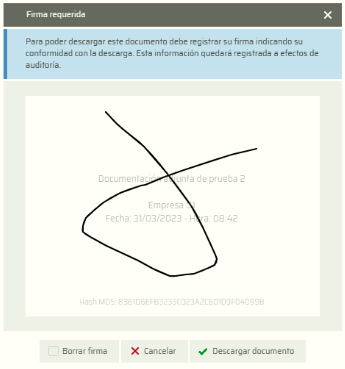 - "Requiere firma (grafo) del usuario previa la descarga". Al marcar esta opción, cuando se descargue esta documentación desde la web solicitará un grafo para que se firme la recepción de la documentación. Tal y como se muestra en la siguiente imagen.