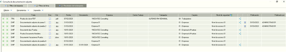 Una vez aplicados los criterios de búsqueda que nos interesen tendremos en pantalla el listado de documentación adjunta deseado.
