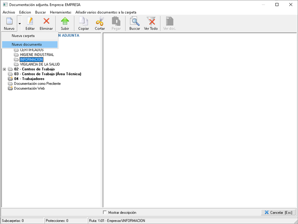 La biblioteca ya dispone de carpetas por defecto pero podrá editarlas, incluso eliminarlas si no contienen documentos en la empresa en la que acceda o crear nuevas. Tenga en cuenta que estas carpetas son comunes a todas las empresas de su base de datos, es decir no puede tener diferente estructura de carpetas para las diferentes empresas.