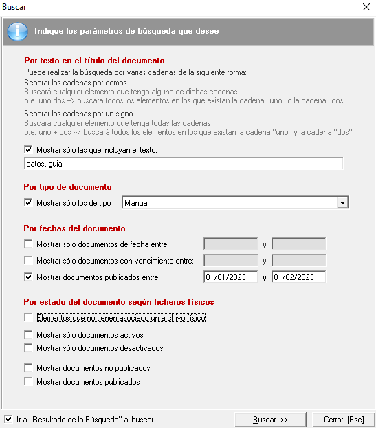 - Búsqueda por texto en el título del documento. Mediante esta opción el usuario podrá realizar búsquedas encadenadas, de manera que localice varios elementos de distinto nombre. Esta búsqueda es disyuntiva, es decir, si no encuentra coincidencias del primer nombre del documento pasará al siguiente mostrando los resultados de este, y así hasta finalizar toda la cadena. Para hacer una búsqueda encadenada, deberá separar el texto con comas. Por ejemplo, "datos, guia" buscaría coincidencias entre todos los elementos que contengan "datos" o "guia".
