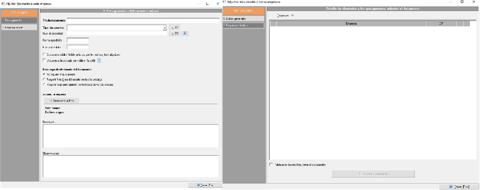 El formulario para el proceso es el que vemos en la siguiente imagen, en la que se aprecia una ficha de datos similar a la que hemos visto anteriormente con una diferencia en el último apartado dónde añadiremos a las empresas a las que queremos añadirle este documento. Por último pulsaremos el botón inferior de "Adjuntar documento a la documentación de empresas" para que quede el documento adjuntado a la biblioteca de docuemtación de dichas empresas.
