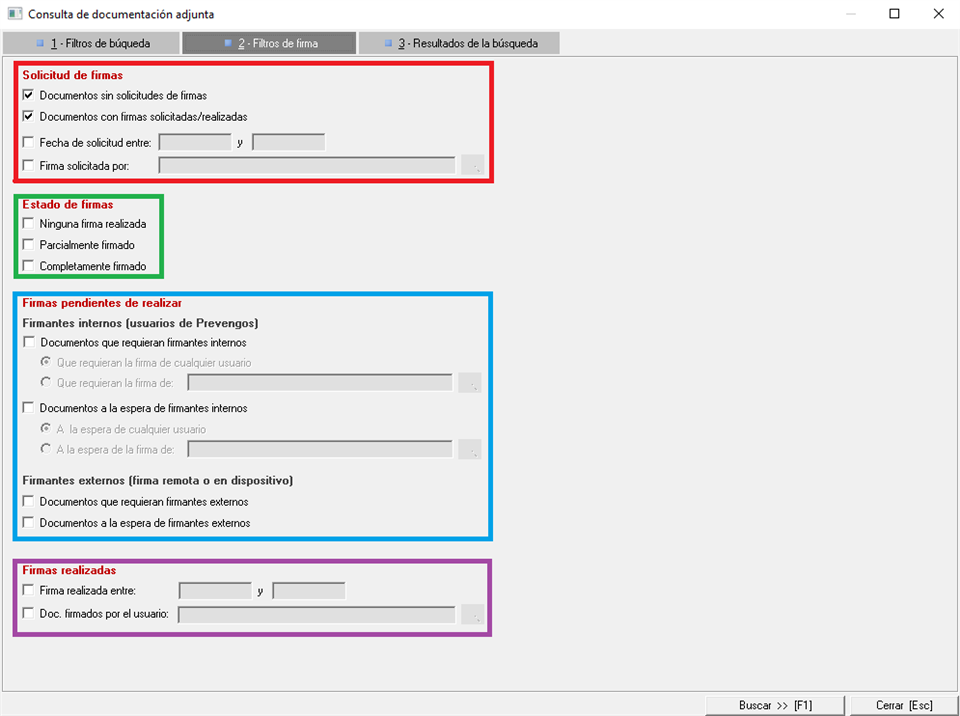 - Solicitud de firmas (rojo): puede limitar la búsqueda a aquellos documentos que se han firmado o que no se han enviado aún a firmar, concretando una fecha de solicitud de firma o el usuario de Prevengos que la solicitó.