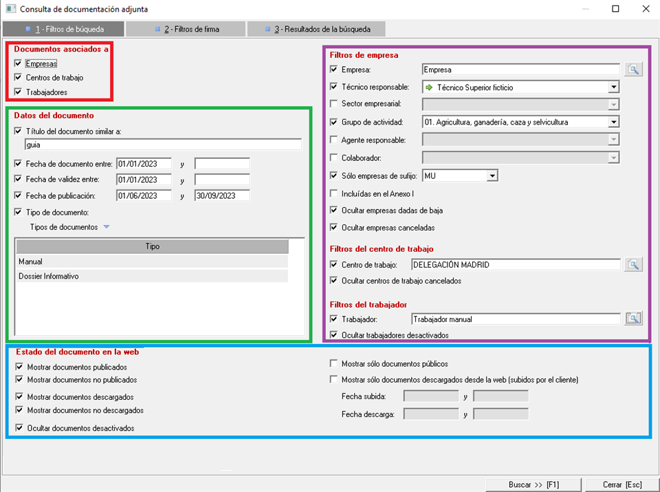 En esta pestaña de filtrado se disponen de opciones referentes al elemento al que se ha aplicado la documentación adjunta (rojo), datos propios del documento (verde), estado del mismo en la web (azul) y datos generales de empresa, centro y trabajador (morado).