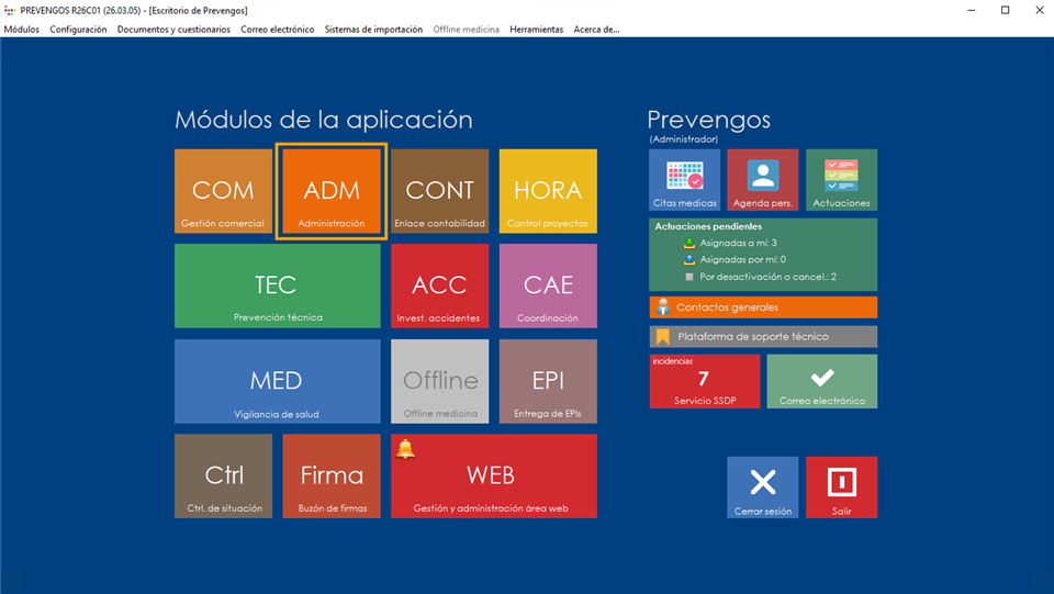 Al iniciar sesión en Prevengos, el usuario accede a la pantalla principal donde se muestran los módulos habilitados según la licencia contratada. Para acceder al módulo de administración, basta con pulsar el botón ADM.