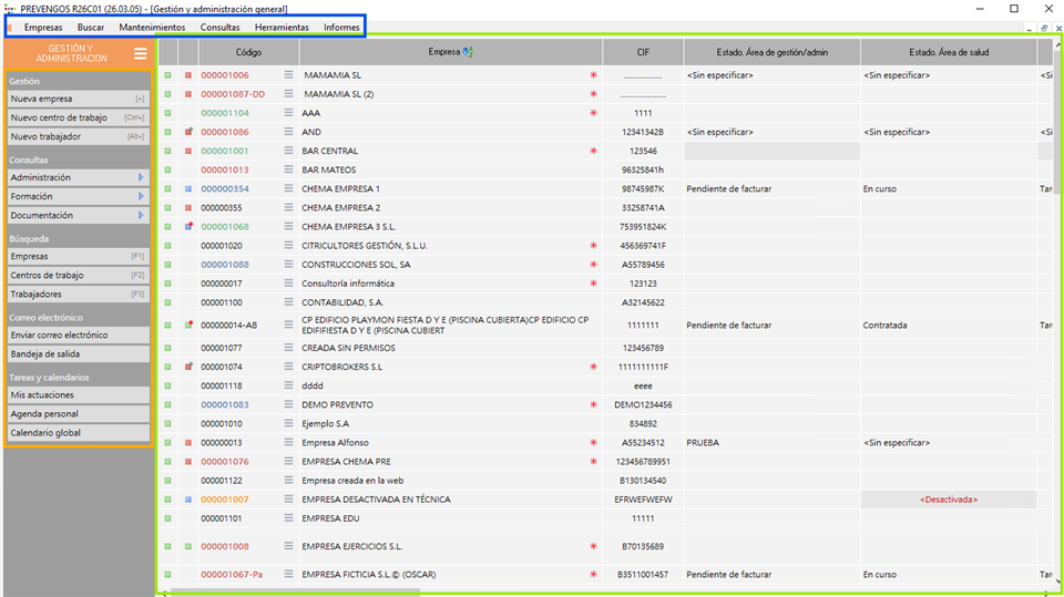 En la parte superior, destacado dentro de un cuadro azul dispone de la barra de menús, en la parte central destacado con un cuadro verde dispone del listado de empresas disponibles en el módulo de administración y en la columna lateral destacado con un cuadro naranja dispone de accesos directos a gestión de empresas, consultas, buscadores, tareas e informes.