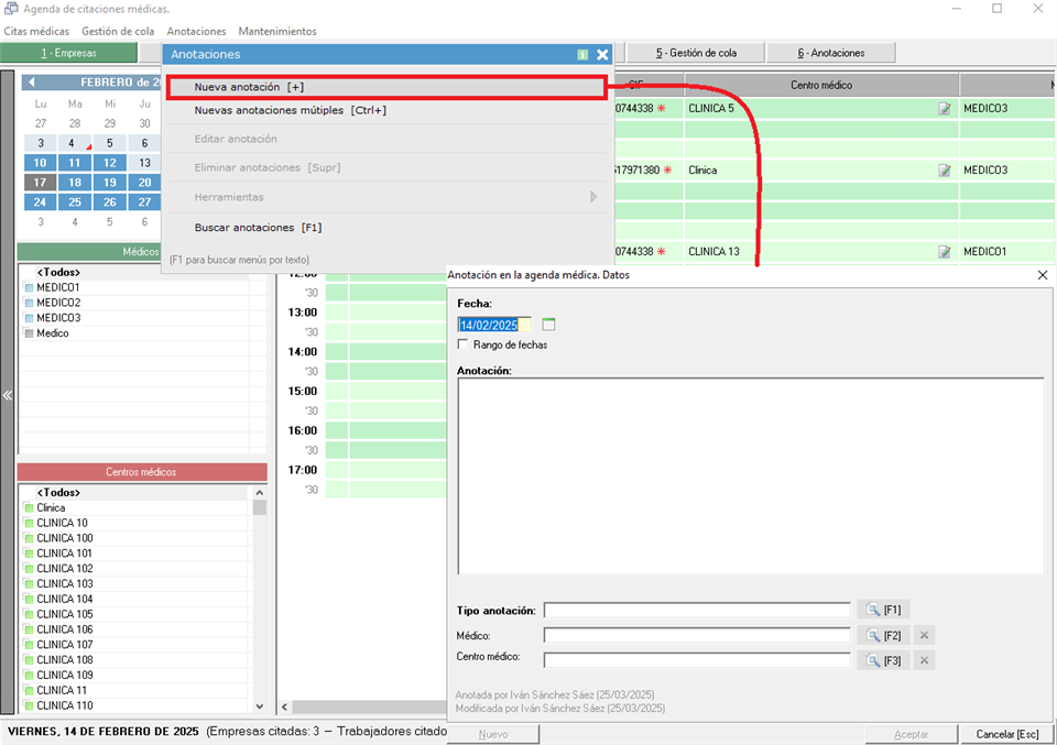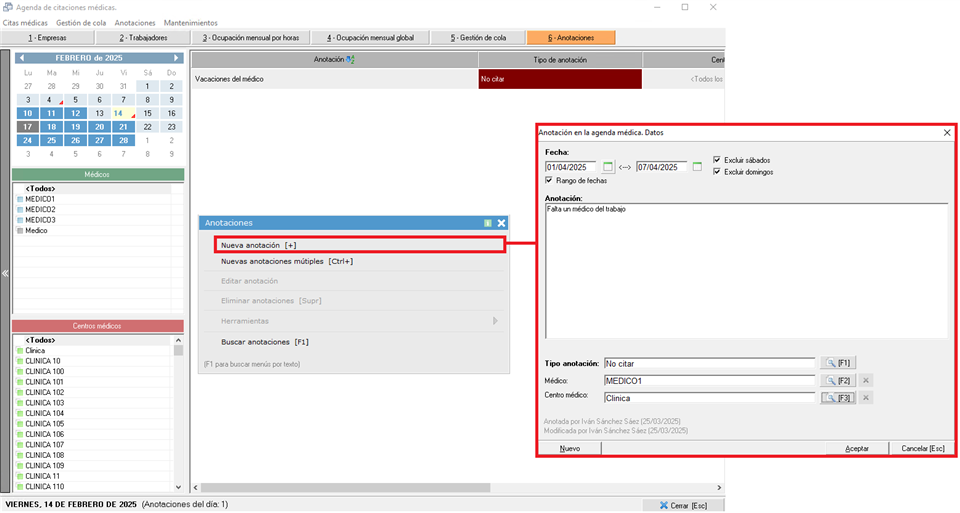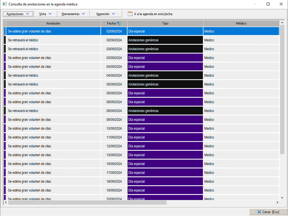 La anotación en la agenda médica se crean sobre un día, teniendo la posibilidad de crear una anotación para un rango de fechas, lo que haría crear la misma anotación para todos esos días. Deben ser tipificadas obligatoriamente, pudiendo asignar un color según el tipo de anotación. Además, opcionalmente, se puede asignar el médico y el centro médico sobre el que se crea la anotación.