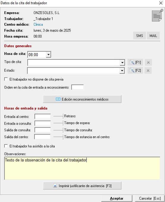 En cuanto a las observaciones de la cita del trabajador, deberá indicarlas con la vista "Trabajador" de la agenda médica, abriendo la ficha de datos de la cita en cuestión: