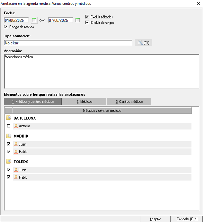 Dispone de varios médicos: (Juan, Pablo y Antonio) y de varios centros médicos (Madrid, Toledo y Barcelona). Necesita crear anotaciones para indicar que Juan y Pablo están de vacaciones la primera semana de agosto y son médicos que trabajan en el centro de Madrid y el de Toledo.