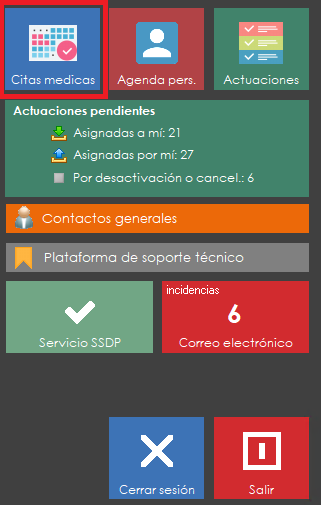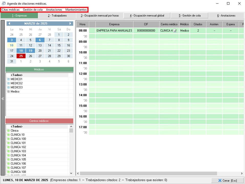 - Menú superior, también llamado barra de herramientas y que hemos resaltado mediante un recuadro rojo. En el encontramos los menús Citas médicas, Gestión de cola, Anotaciones y Mantenimientos. En el resto de manuales se explicará cada una de estas opciones.