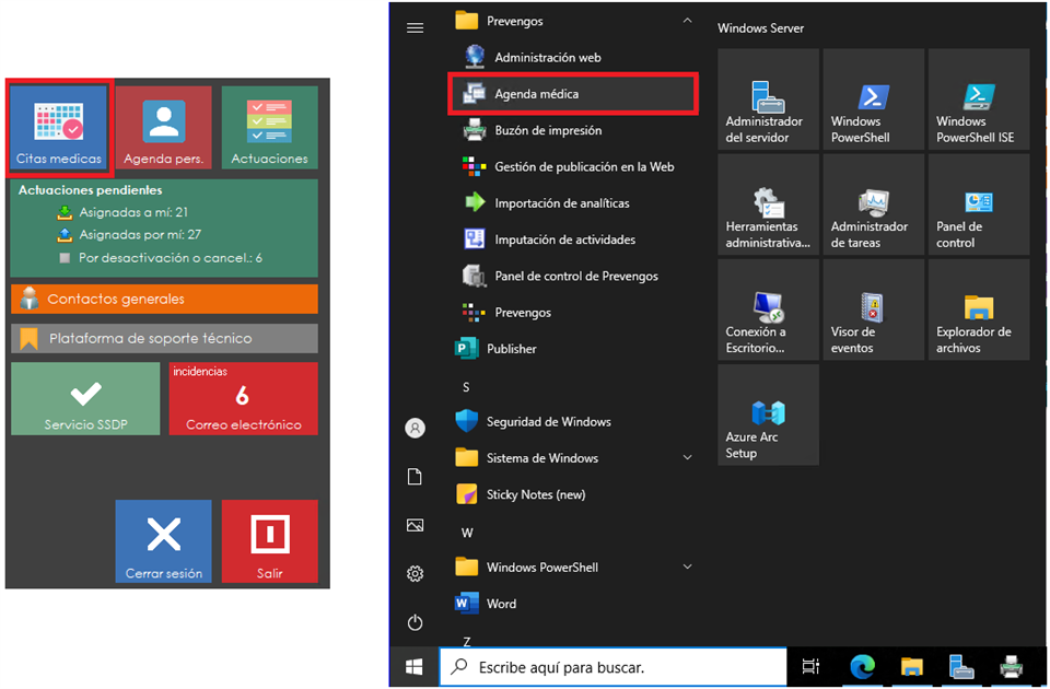 Con esta herramienta podemos gestionar las citación de los trabajadores a la hora de realizar sus reconocimientos médicos. Podemos acceder a la herramienta desde la propia pantalla principal de Prevengos (imagen izquierda) o desde la carpeta de instalación de Prevengos mediante el acceso ubicado en Inicio de Windows (imagen derecha), llamada también "Agenda externa".