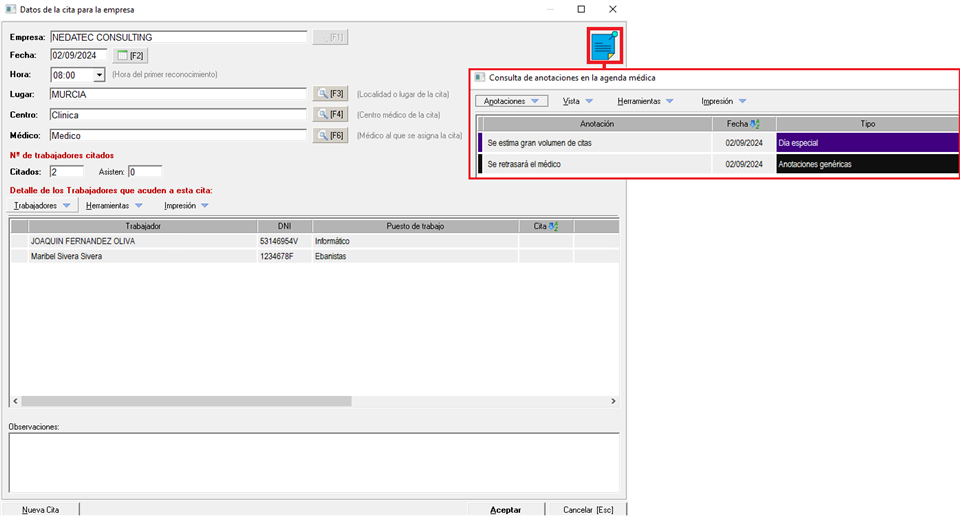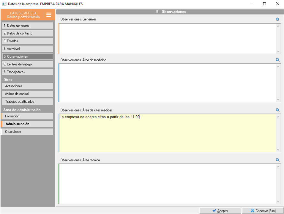 Existe un apartado para añadir y visualizar las observaciones generales relacionadas con las citas de la empresa, por ejemplo, describir unos horarios de preferencia de citas o unas anotaciones relacionadas con las características de los trabajadores de la empresa que se deban tener en cuenta a la hora de acudir a consulta.