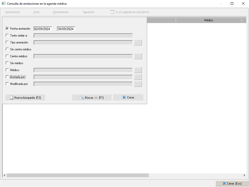 Desde el menú superior, tanto desde la opción "Citas médicas" como desde "Anotaciones", puede abrir el Buscador de anotaciones. En él, puede utilizar filtros relativos a los datos de la anotación: fecha, tipo, centro médico, usuario que hace la anotación, etc.