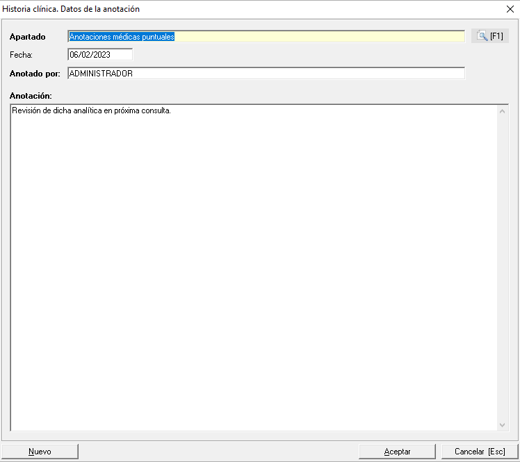 Para crear anotaciones nuevas podremos realizarlo desde el menú desplegable "Anotaciones" o el botón derecho del ratón y "Nueva anotación". Se nos abrirá un mantenimiento tipo lista para que seleccionemos o creemos el apartado en el que queremos incluir nuestra anotación, y una vez seleccionado, aparecerá una nueva ventana donde los campos fecha y anotado por vendrán automáticamente cargados por Prevengos tomando la fecha del equipo en el momento de su creación y el Usuario que actualmente esté utilizando Prevengos. Más abajo un campo de texto para describir nuestra anotación.
