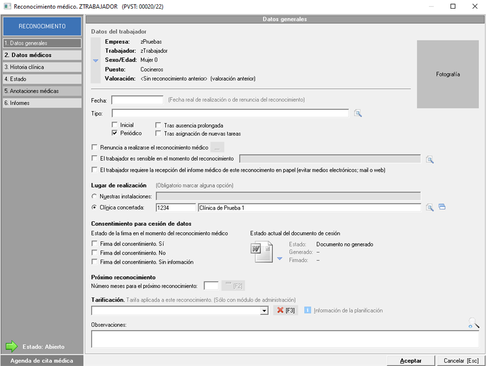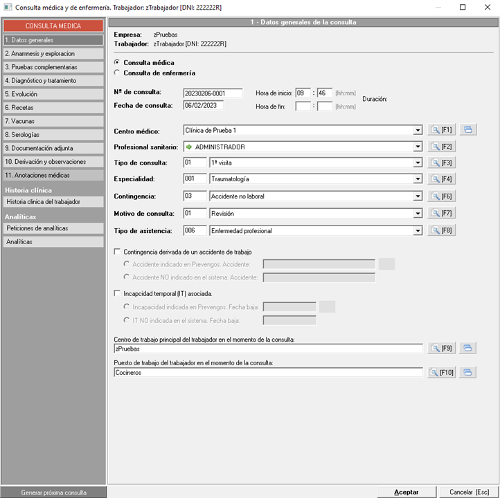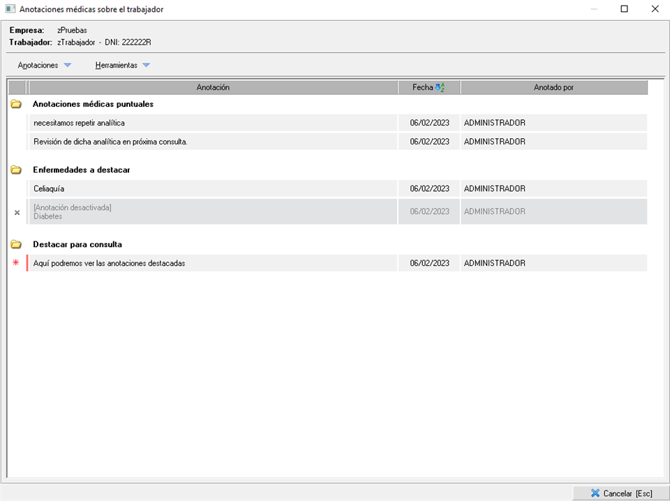 El apartado de anotaciones médicas lo podemos encontrar tanto dentro de los reconocimientos en el punto 5, como en la consulta médico-asistencial en el punto 11 y dentro de la ficha del trabajador en el módulo de Gestión dentro del apartado de medicina. Sólo podrán acceder aquellos usuarios que tengan los permisos sanitarios oportunos. Esta información no aparece en ningún informe.
