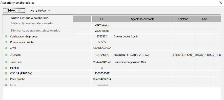 El menú Mantenimientos > Asesorías y colaboradores da acceso al formulario para gestionar los asesores/colaboradores.