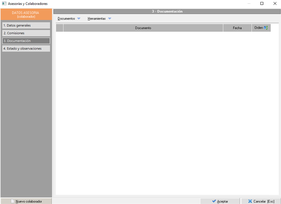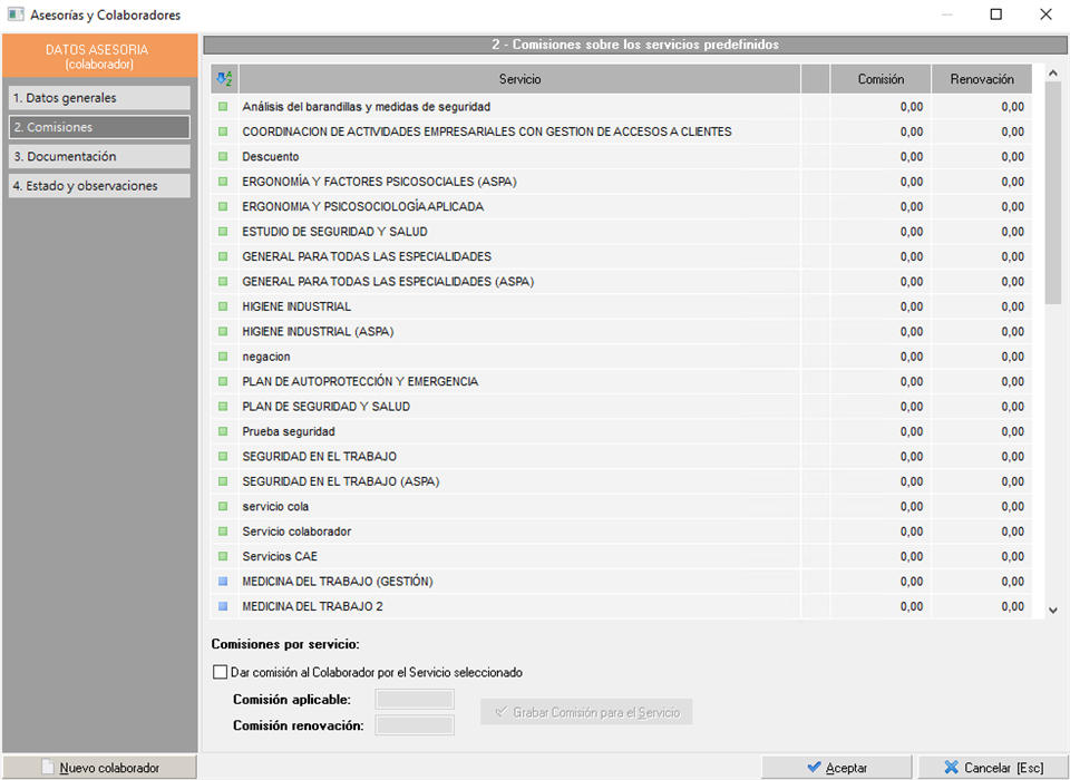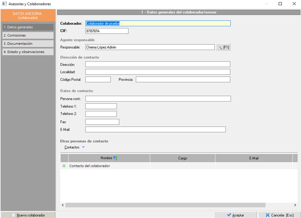 , que da acceso al mantenimiento de asesorías y colaboradores, y repercute en la asignación de comisiones en contratos y facturas.