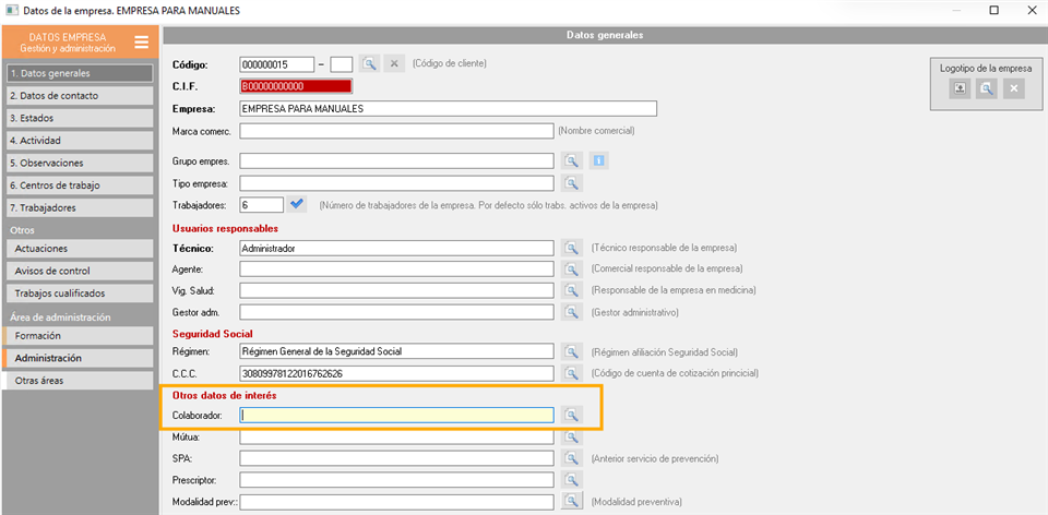 Para vincular una empresa con un colaborador o asesoria, debe abrir la ficha de datos de la empresa, en la pestaña "1. Datos generales" > "Otros datos de interés" , dispone del campo 'asesoría/colaborador'.