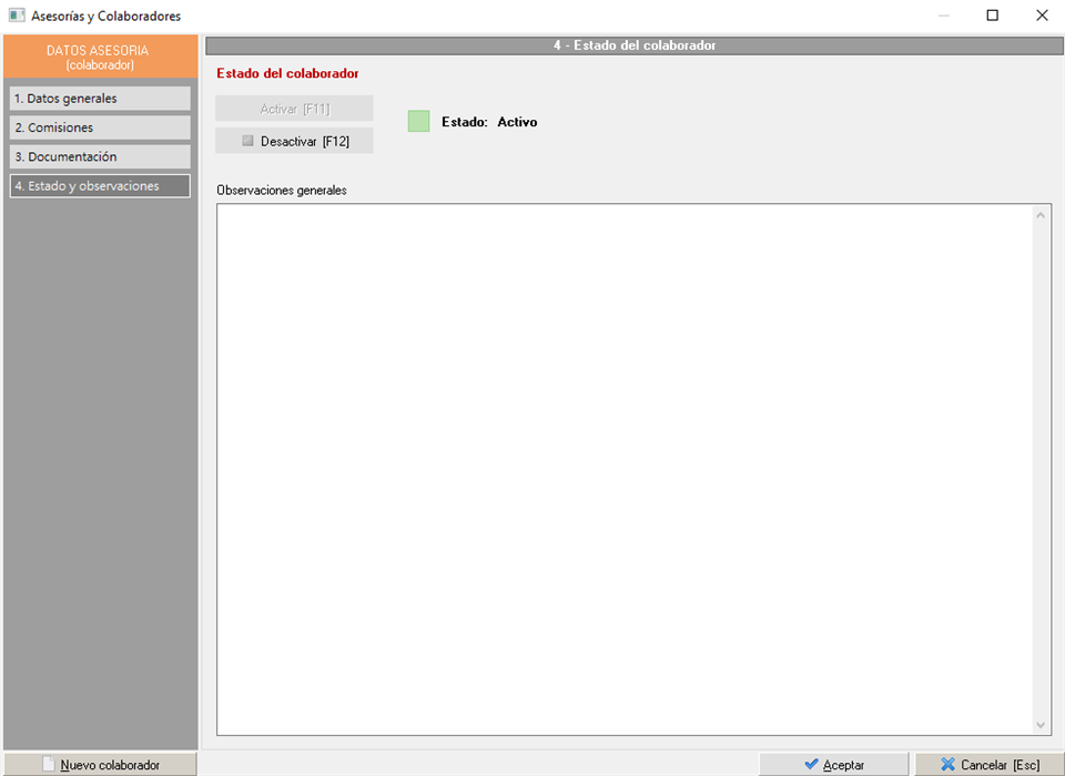 Permite la desactivación/activación de la asesoría/colaborador, según la relación con el Servicio de prevención y dispone del campo "Observaciones" para información que desee reflejar.