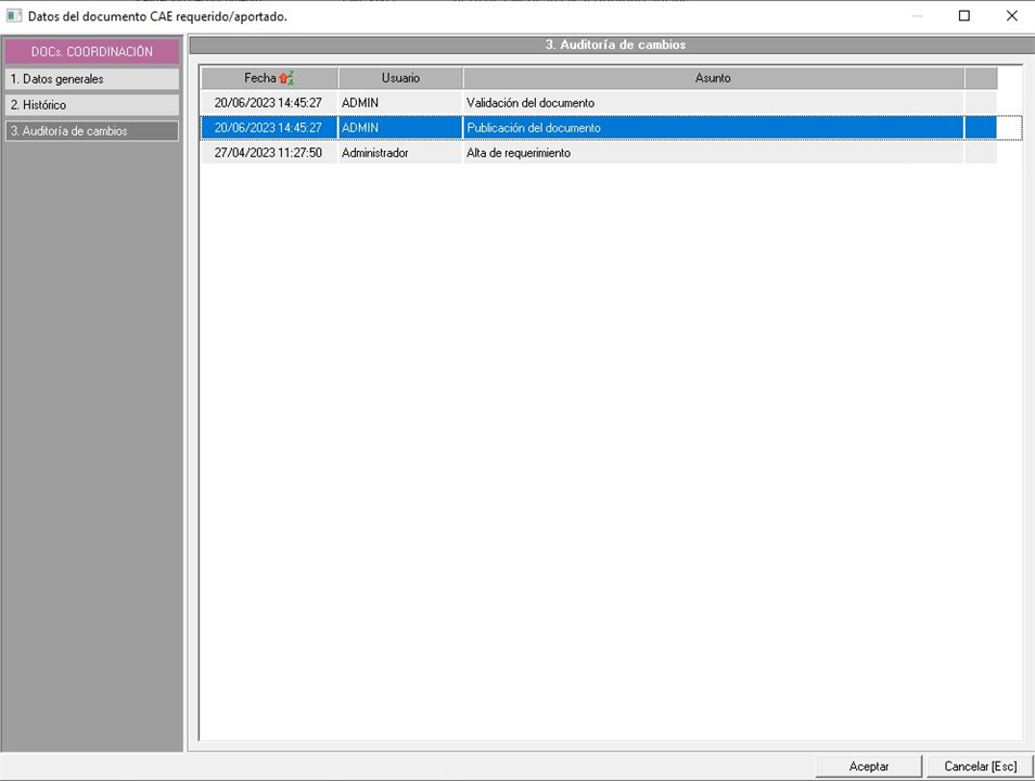 Para que podamos ver la auditoria de los documentos, ésta debe estar habilitada en el mantenimiento de Modelos de documentos ofrecidos/requeridos en coordinación, tal y como vimos en este manual. Una vez que lo tengamos habilitado podemos consultarla de dos maneras:
