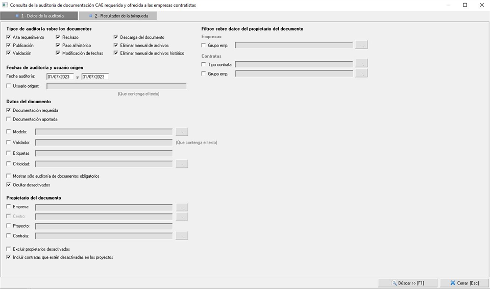 - Fechas de auditoría y usuario origen. En este caso podemos filtrar por un rango de fechas (o día en concreto si lo ponemos en ambos campos) o por un usuario origen del cambio de estado. Solo se consideraran los documentos que cumplan con ambos requisitos.