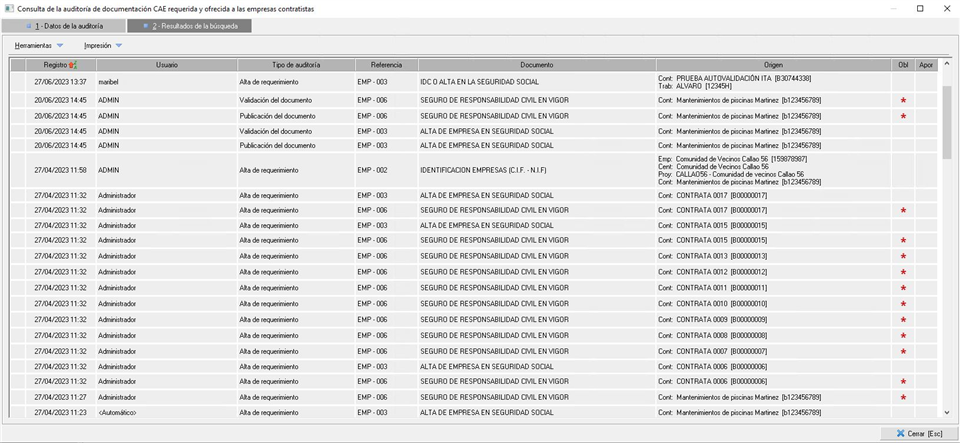 Como apreciamos en esta imagen, tenemos un listado con los documentos que cumplen los filtros aplicados deseados, mostrándose para todos ellos la fecha de registro, el usuario que realiza el cambio, el tipo de auditoría, la referencia, el documento, el origen del mismo y si es obligatorio o no.