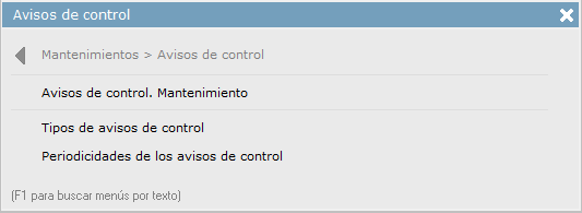 En el momento de crear un aviso de control, usaremos el desplegable [Avisos de control] y seleccionaremos [Añadir avisos de control]. Se nos abrirá el mantenimiento de avisos de control donde debemos seleccionar el que queramos añadir, tras eso una ventana nos preguntará por la fecha de vencimiento, una vez introducida se habrá creado ya el aviso de control.