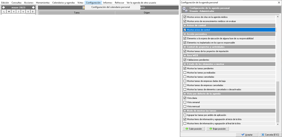 Con el formulario en pantalla tendrá que usar el menú Configuración > Configuración del calendario personal, para acceder al formulario de elementos a mostrar. La agenda sólo tendrá en cuenta los avisos de control sobre empresas, centros, trabajadores y equipos del inventario.