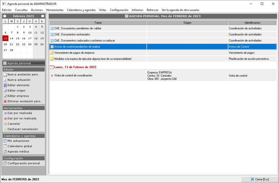 Como usuario de Prevengos, desde la agenda personal podrá gestionar los elementos del aplicativo en los que es responsable, como es el caso de los avisos de control, siempre que esté configurada para ello.