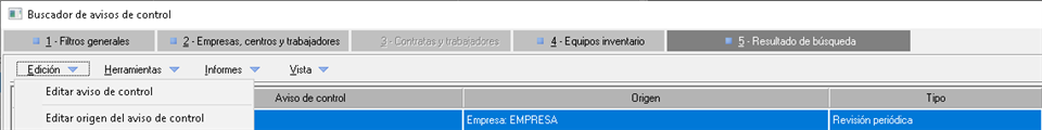 Los elementos sobre los que podemos crear avisos de control son diversos, como pueden ser Empresa, centro de trabajo, trabajador, dentro del área técnica de la empresa, a un elemento del inventario...