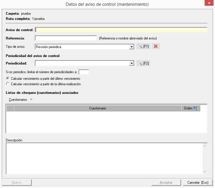 Por último, podemos añadir cuestionarios a realizar o una breve descripción con el fin de facilitar el poder reconocer el aviso de control que queremos insertar.