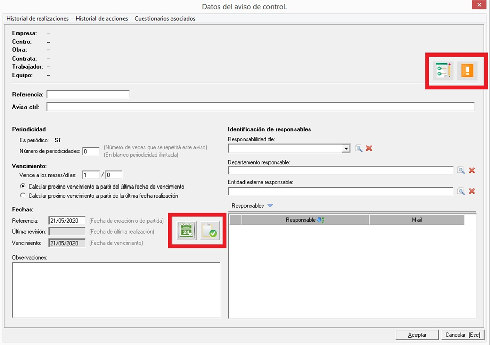 Vamos a explicar los elementos que vemos en esta ventana, mención especial a los dos iconos en el rectángulo rojo situado en la parte superior derecha. Estos iconos nos servirán para crear un parte de inspección o una incidencia con los datos que recoja Prevengos del aviso de control. Prevengos envía notificaciones en ambos casos, Partes de inspección e incidencia, por correo electrónico a los responsables.