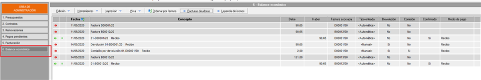El balance económico de Prevengos es el registro de facturas emitidas y pagos asociados a las mismas, así como otras entradas como devolución de recibos. Lo que en contabilidad puede encontrar en el mayor de la cuenta de un cliente.