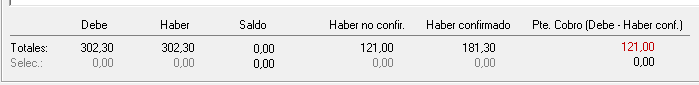 Totales - Pte. Cobro (Debe-Haber.conf.): Es la diferencia entre el total del debe y el total del haber confirmado, es decir, lo que tiene pendiente de cobro por parte del cliente.