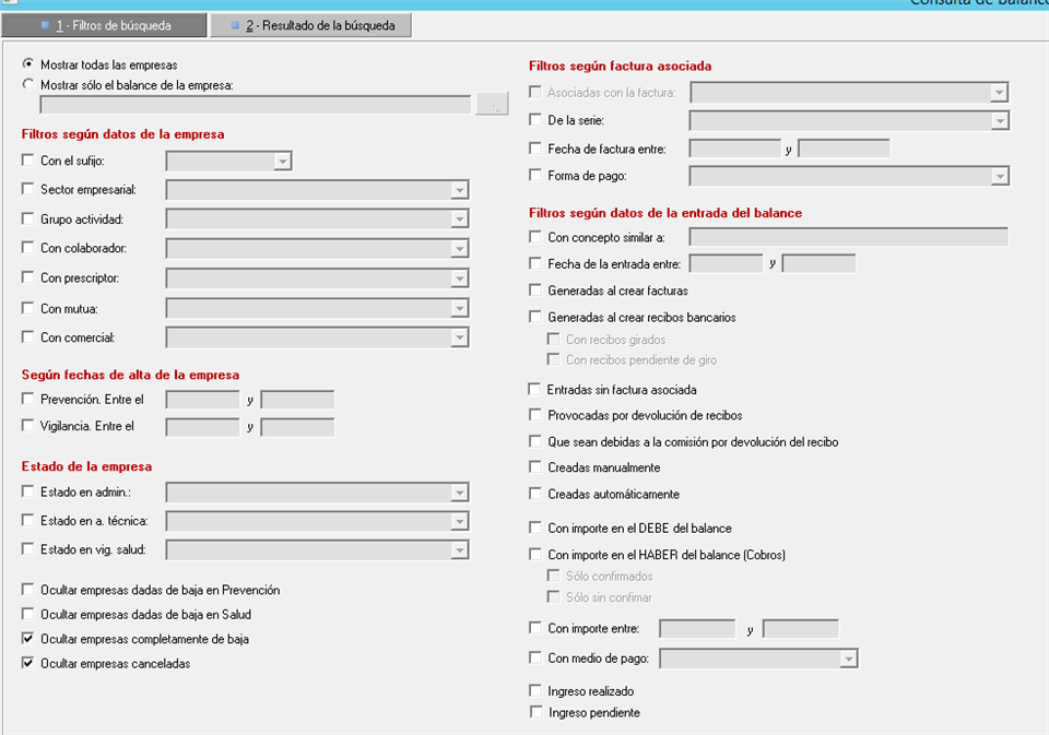 Marque los filtros que necesite para acotar la busqueda según sus necesidades. Una vez obtenga los resultados deseados, las herramientas son las misma que puede encontrar en el "Balance económico desde la ficha del cliente".