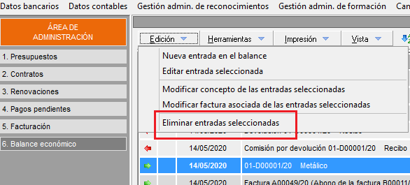 Para eliminar una entrada de pago de una factura, (siempre que no sea un recibo), debe seleccionar la línea correspondiente y con el menú superior 'Edición->Eliminar entradas seleccionadas'