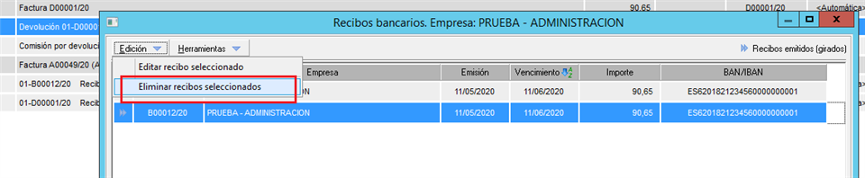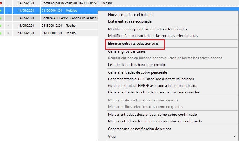 En primer lugar debe tener en cuenta que si un recibo aparece como remesado no le permitirá eliminarlo. Deberá primero marcarlo como 'Marcar recibo seleccionado como no girado'.