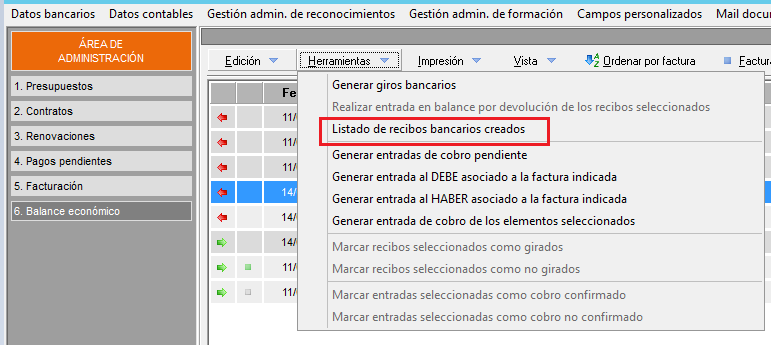 Para ver el balance de una empresa, debe entrar en el área de administración dentro de la ficha del cliente Área de Administración y ir al punto 6. Balance económico.