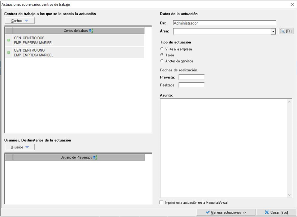 Con esta herramienta se podrá crear una actuación sobre uno o varios de los centros de trabajo que resulten de la búsqueda.