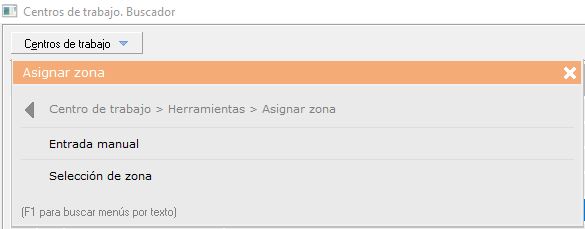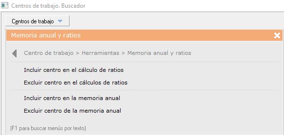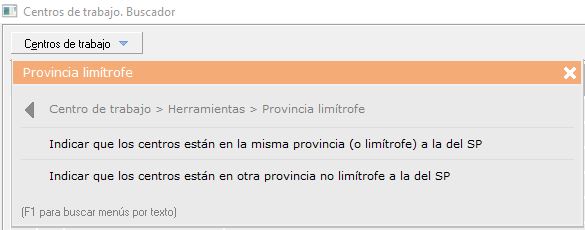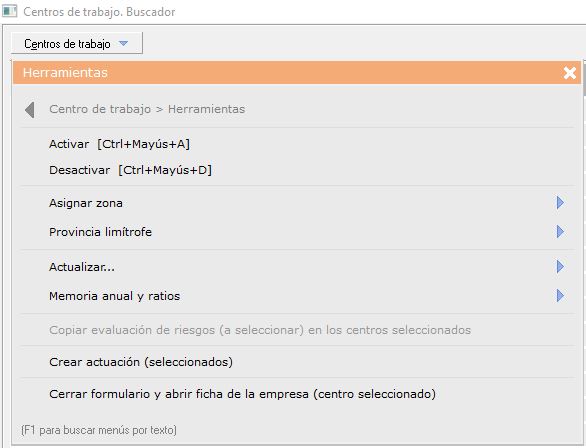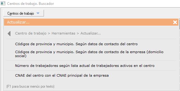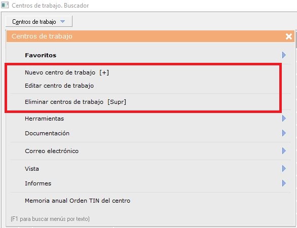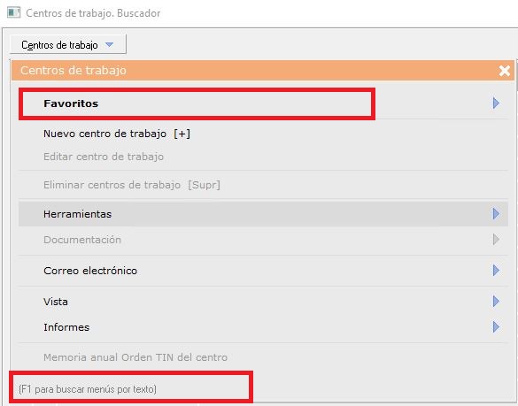 - [F1] Búsqueda de menús por texto. Una vez desplegado el menú 'Centros de trabajo', si pulsa sobre su teclado [F1] podrá buscar rápidamente la opción que necesite, escribiendo el texto, sin necesidad de ir abriendo pestañas