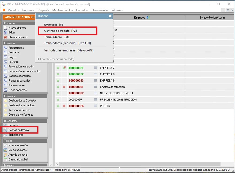 Se puede acceder al buscador de centros de trabajo desde los módulos de Administración, Prevención Técnica, Investigación de Accidentes, Vigilancia de la Salud y Entrega de EPIs. En todos estos módulos el usuario podrá acceder al buscador mediante dos vías: desde el menú superior 'Búsqueda', seleccionando 'Centros de trabajo [F2]', o bien desde el acceso directo 'Buscadores/Centros de trabajo' que aparece en el panel izquierdo del módulo. A continuación se muestra una imagen del módulo de Administración donde se señalan ambos accesos.
