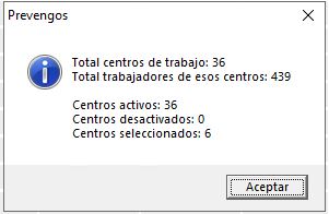 Al igual que en otros listados de Prevengos, pulsando en el teclado [Ctrl+T] se abrirá una pequeña ventana donde se indicará el número total de centros de trabajo que aparece en el listado resultante de la búsqueda, de trabajadores incluidos en dichos centros, así como el número de centros de trabajo activados, desativados y de centros que se hubieran seleccionado antes de pulsar [Ctrl+T].