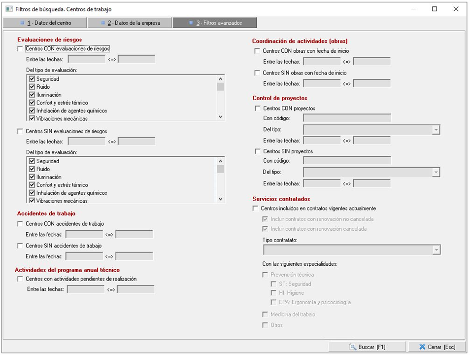 3. Filtros avanzados. En la última pestaña existen diversos filtros referidos al estado del centro en materia de prevención. Así, podemos filtrar por centros con/sin evaluación de riesgos, con/sin accidentes de trabajo registrados, con actividades del programa anual técnico pendientes de realización. También podrá filtrarse por centros de trabajo que estuvieran realizando coordinación de actividades, con proyectos y/o por centros que estuvieran incluidos en un contrato vigente.