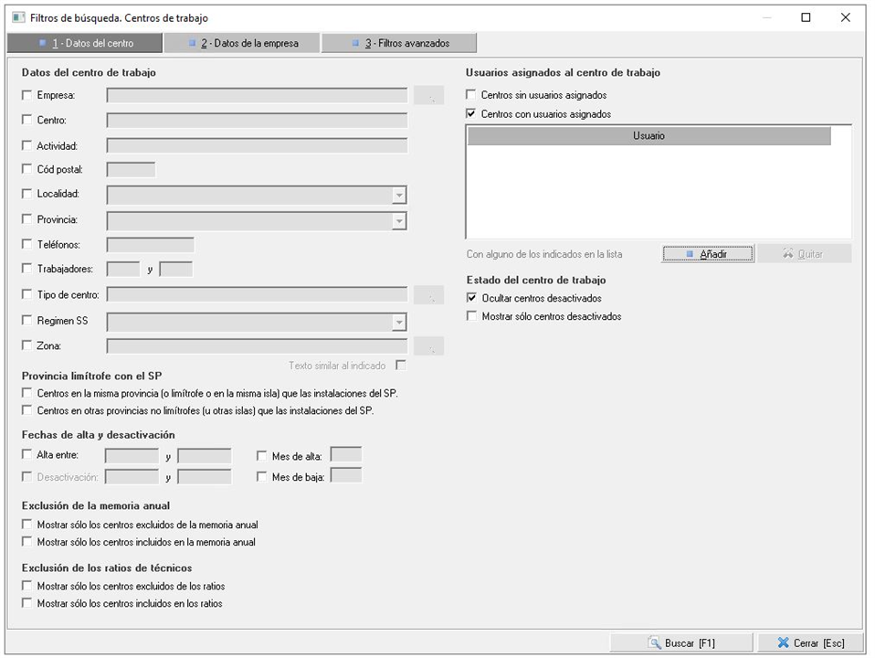 1. Datos del centro de trabajo. Contiene filtros referidos a datos del centro, fechas de alta y desativación, inclusión en la memoria anual, usuarios de Prevengos asignados al centro de trabajo, y estado del centro.